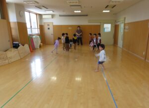 今日はホールでラジオ体操とマラソンごっこをして