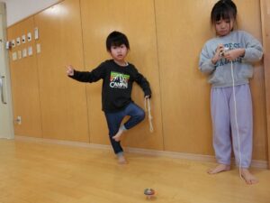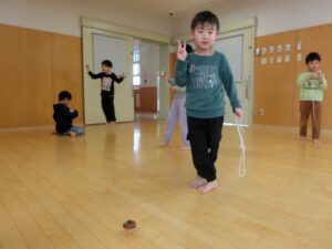 その後は、コマ回し!紐が上手に巻けるようになってきて、