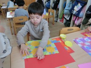 染めていた半紙を画用紙の土台に貼りました。
