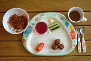 ハヤシライス、お茶、ミートボールの甘露煮、