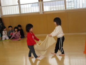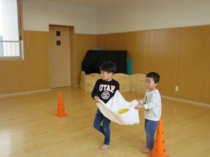 お部屋で過ごした後はホールですみれ組のお友だちとボール運びゲームに再挑戦!!