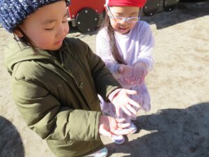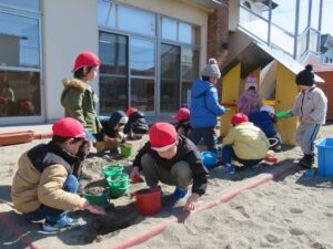 砂場で山を作ったり、穴を掘ったり、お店屋さんごっこをしたり・・・