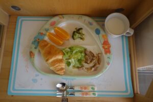 クロワッサン、ミルク、豚肉と玉ねぎのソテー、