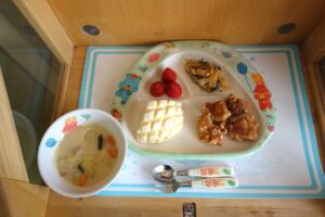 メロンパン、豆乳シチュー、とりのからあげ、