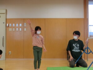 たんぽぽ組さんと一緒にラジオ体操やマット運動、スキップ、鉄棒などをしました。