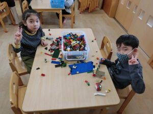 お部屋では、レゴブロックやマグブロックでお友だちと協力して大きな家を作ったり、