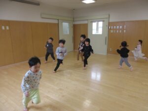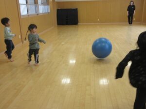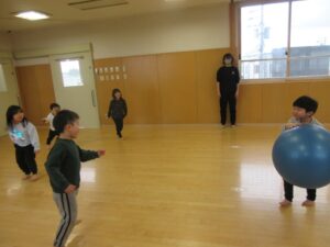 体操の後は、マラソンをして体をあたため、今日は転がしドッチボールをしました!!