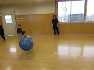 大きなバランスボールに「重い…」と負けそうになりながらも力いっぱいに転がしたり、投げたりして新しい転がしドッチボールを楽しみましたよ✨