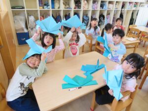 保育者と一緒に折り三角の形になると「できた!」と嬉しそうでした🎵
