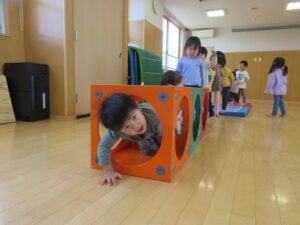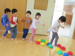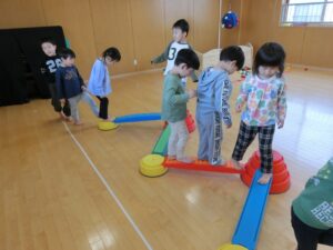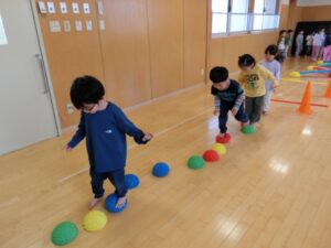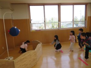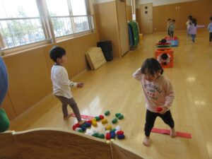 平均台やマット、玉投げコーナーなどたくさん体を動かしました。