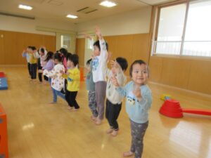 まずは、準備体操で「どうぶつ体操」を踊っています!