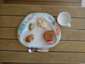 ぶどうパン、ミルク、メンチカツ、