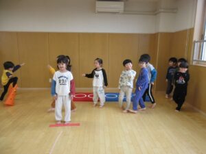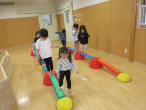 バーの下を腹這いでくぐったり、マットの上でどんぐりころころと