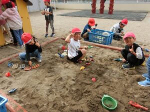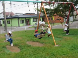 ブランコを保育者に初めは押してもらっていたお友だちも自分で足を伸ばしたり曲げたりを繰り返して少しずつ漕げるようになってきていました。
