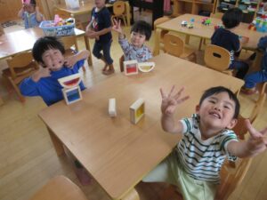 積み木やままごと、ブロックなど好きなおもちゃを出してお友だちと貸し借りしながら楽しく遊んでいますよ✨