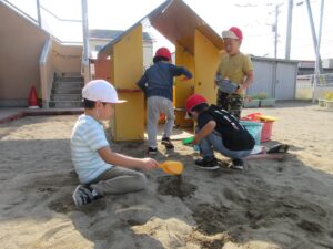 裸足で砂の感触を感じたり、好きな砂場遊具を使ったりと、それぞれが自由に園庭遊びを満喫していました。