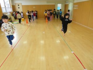 今日のマラソンは笛の合図で方向を変えながら走りました。
