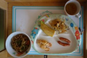 焼きそば、スープ、チーズスティック、ウィンナーソテー