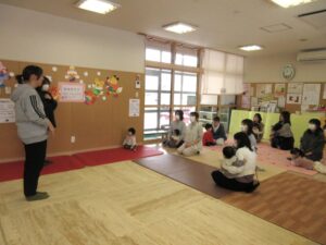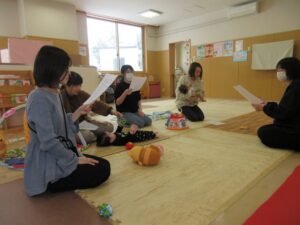 こども園の葛西看護師からAEDの使い方や、心臓マッサージや自宅での嘔吐時の対応について教えてもらいました。
