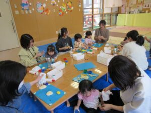 小麦粉と水を混ぜるところからやりました。みんな不思議だね、さらさらがまぜると固まってきたよ。