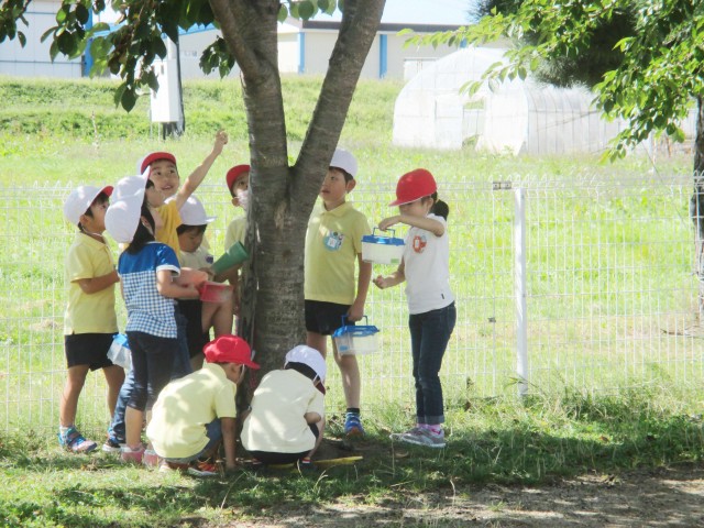 子ども達ですが、今日は桜の木にいる虫を観察。