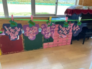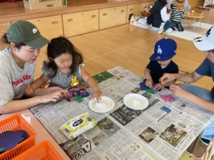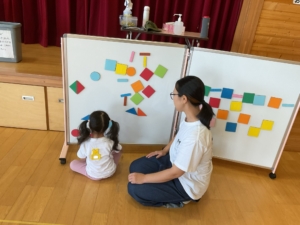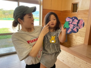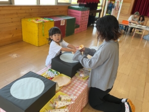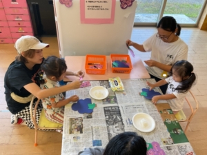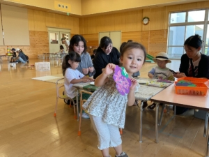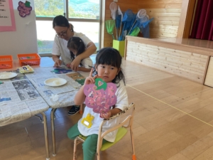 折り紙を手でちぎって、のり貼りをしました。初めてのりに触れるお子さんもいて、ドキドキしながら楽しんでいました。