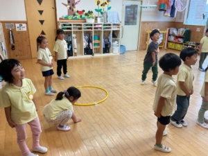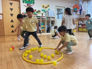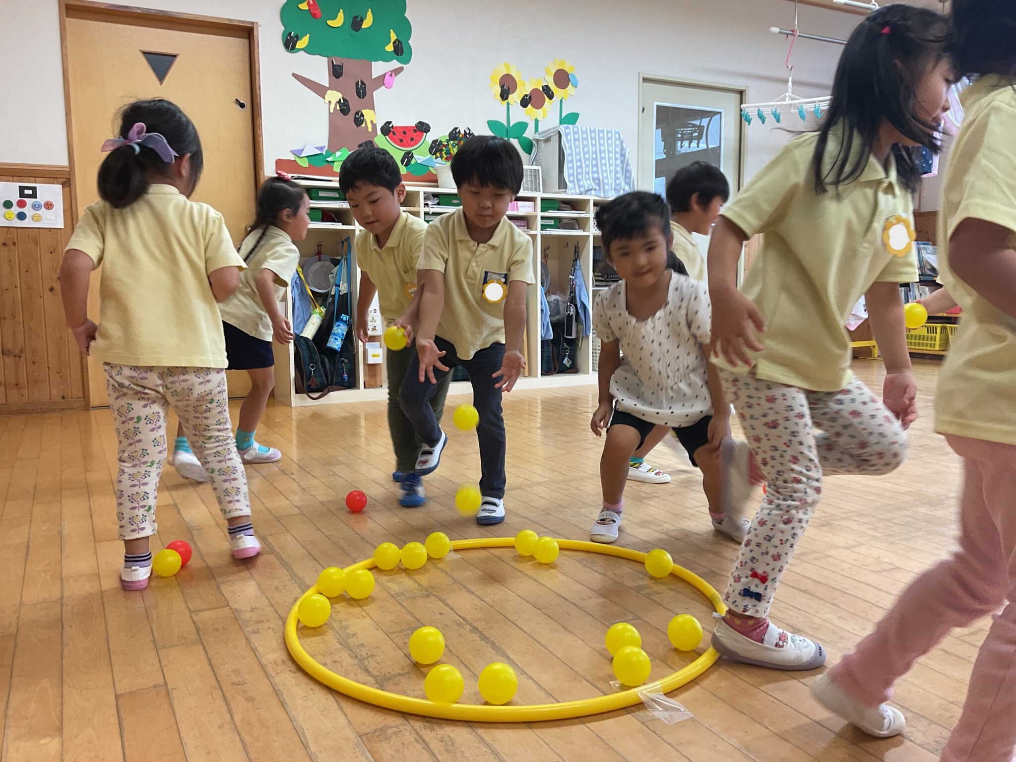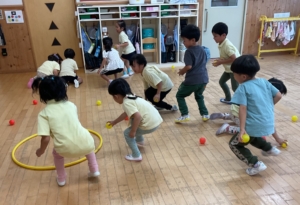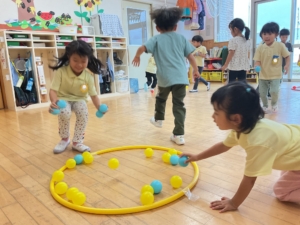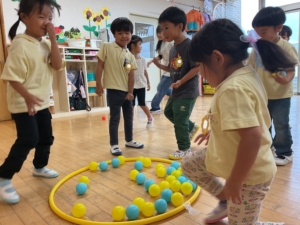 ほしぐみさんでゲーム遊びをしていました。フラフープと同じ色のボールを集めるよ!