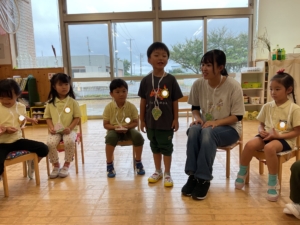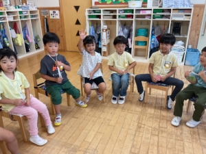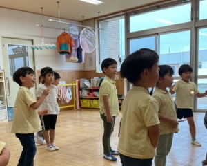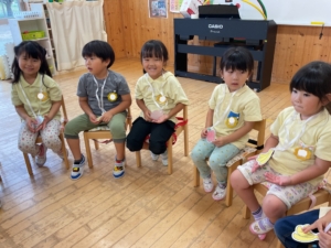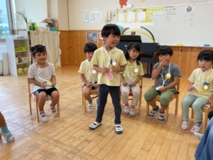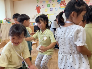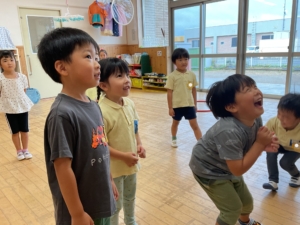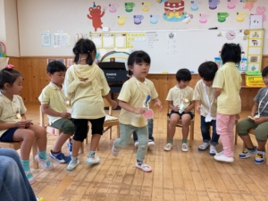 今度はフルーツバスケット。カードと同じ名前を言われたら。お引越しだよ!みんな自分のカードの果物をしっかり覚えて、上手にお引越しできました。みんな、いろんなゲーム遊びのルールを覚えてきたね。