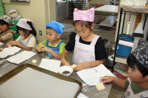 設計図を見ながら、形を作りました。チョコチップで目を付けて、動物やお花の出来上がり