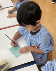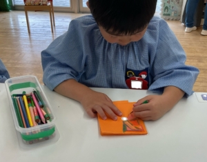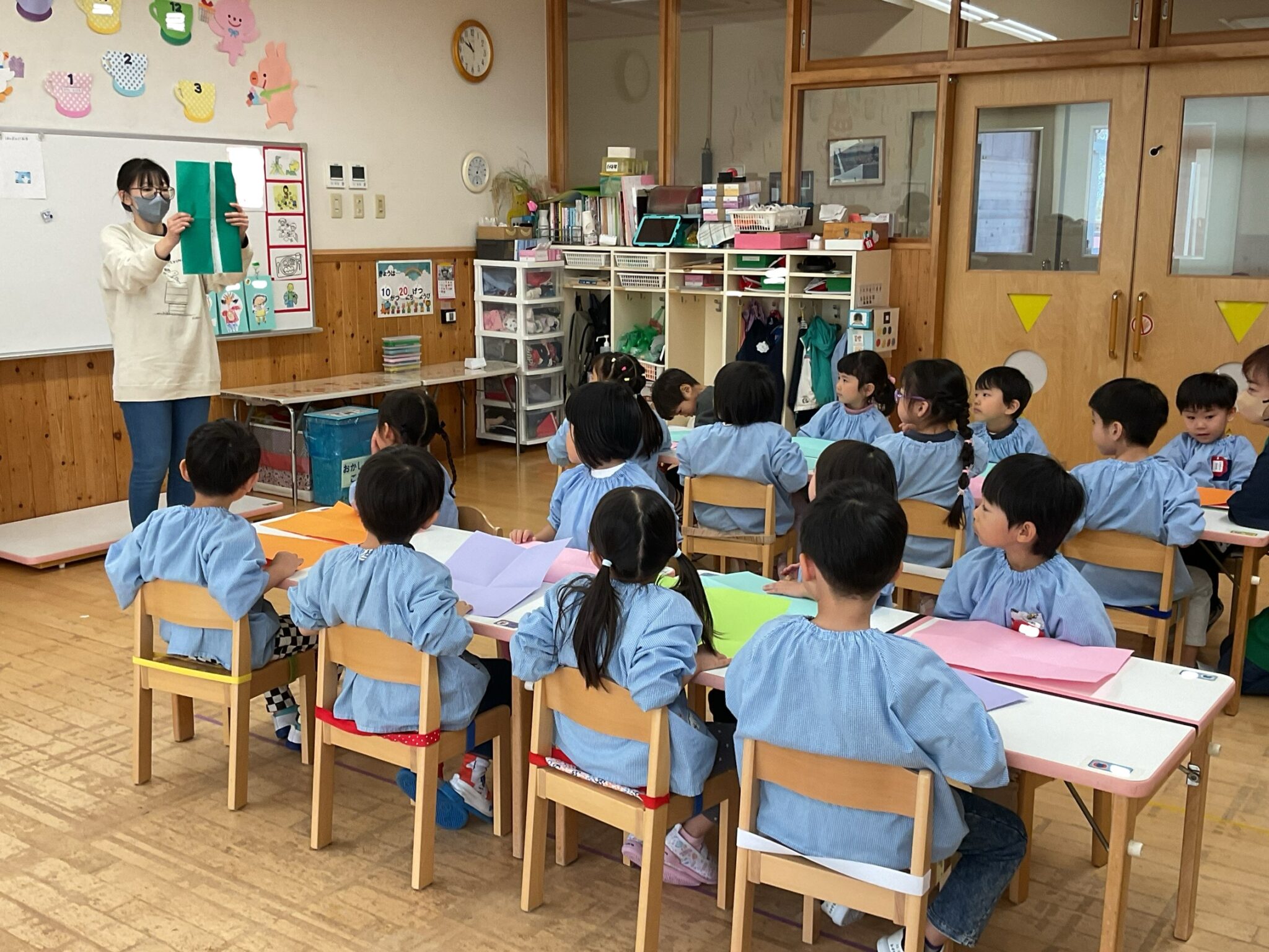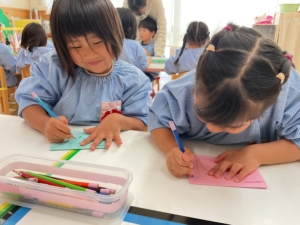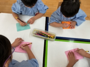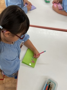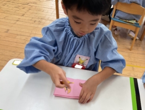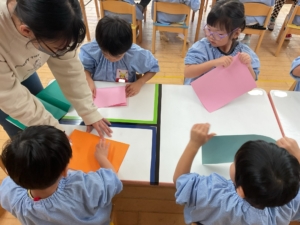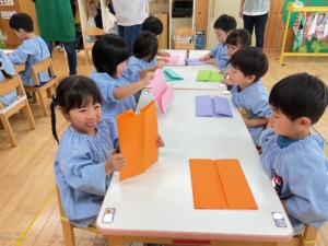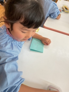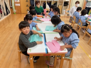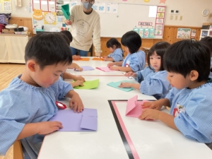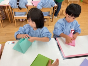 にじぐみではごっこ遊びに必要な、お財布を作っていました。折り方の説明を聞いて折っていきますが、今日の紙は画用紙だから、いつもの折り紙より固いよ、頑張って!