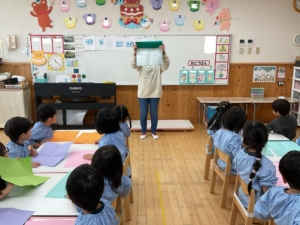 ゆうあい幼稚園では保育の質を高めるために、それぞれの保育を見合いながら「こんな声かけよかったね」「こんな時、こうするともっといいね」とアドバイスし合う園内研修をしています。今日はにじぐみにお邪魔しました。