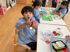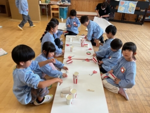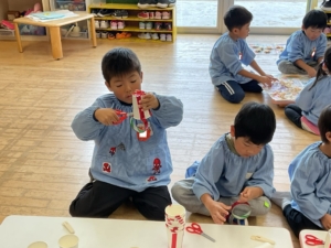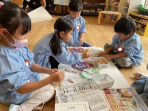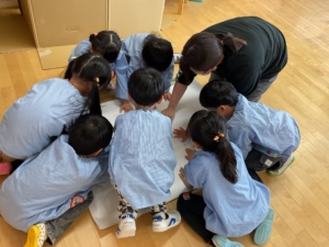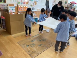 糊を塗った段ボールに、大きな紙を貼っていました。「もう少し下!」「ちょっとシワになってるよ!」一体何ができるのかな。準備に大忙しな毎日、でもみんな楽しそうです✨