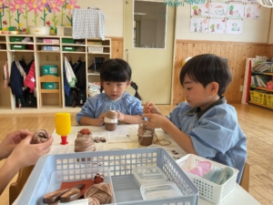 ほしぐみとおひさまぐみがお店屋さんの準備をしていました。