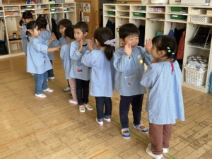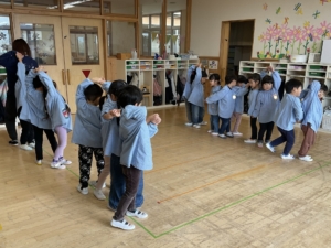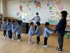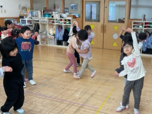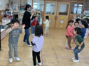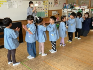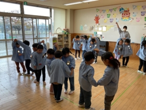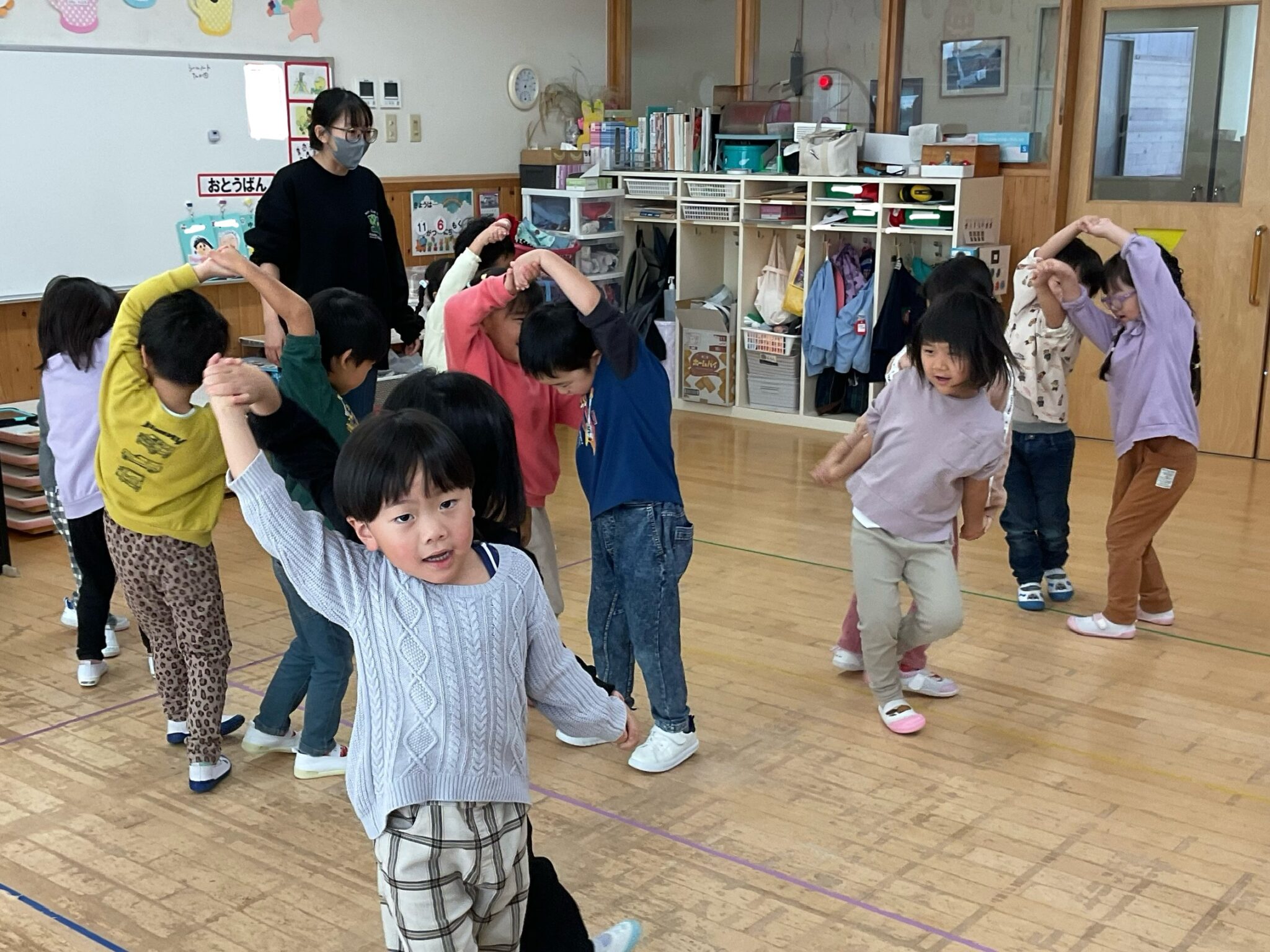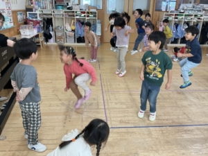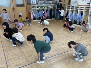 にじぐみ、ほしぐみから、リズム遊びの歌が聞こえてきました。 これまでも何度か挑戦してきた「なべなべそこぬけ」が、とっても上手になっています。 やったね〜!上手にできて嬉しいジャンプ〜! 今度は手裏剣が飛んできたよ!頭手裏剣🥷✨手裏剣に当たらないように小さくなって! 次は足手裏剣🥷✨ぶつからないようにジャンプ! ほしぐみもみんなで並んでなべなべ〜