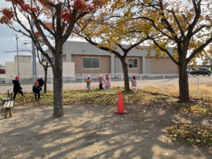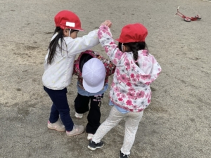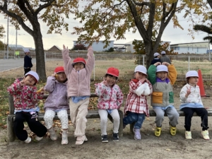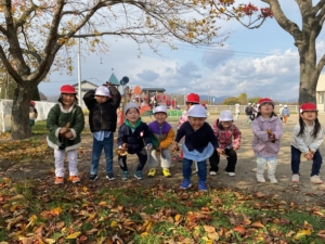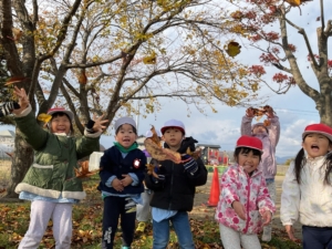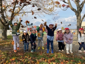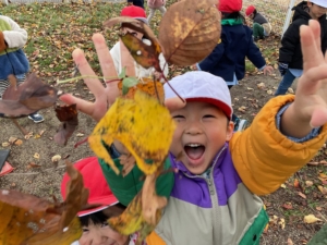 園庭の木々が紅葉し、落ち葉でいっぱいになりました。 「先生、こっち向いて!わあ〜い!」って、落ち葉がいっぱい振ってきました。それを見て、お友達が集まってきたよ。 いっせいのーで!