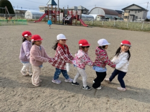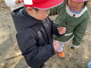それ〜!やった〜先生落ち葉だらけ🍂 こんなところに栗🌰も落ちてる。どうしてだろうねー? 見て、今日も先生ごっこしてるの。 なーべーなーべーそこぬけ〜 さ、お片づけですよ、はなぐみ列車で帰りますよー🚃