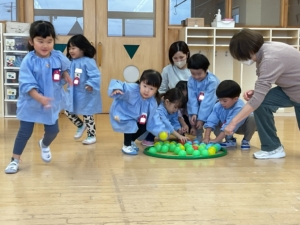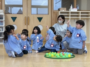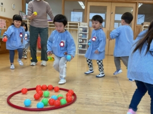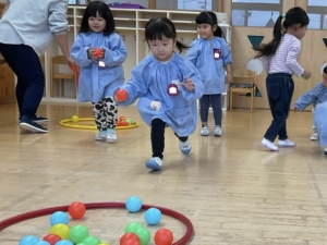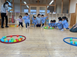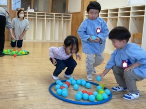次はボールのお引越しゲーム!バラバラになったボールを、同じ色のフラフープに入れるよ。みんな、違う色のボールを見つけられるかな?