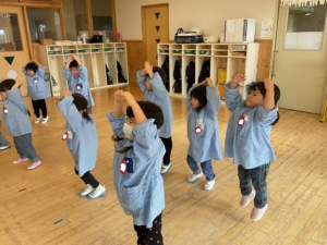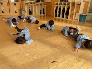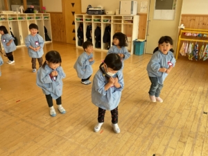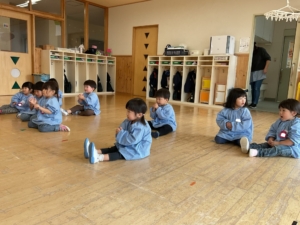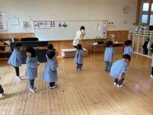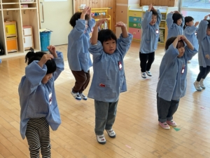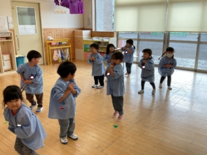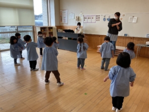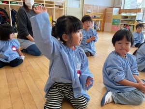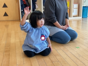 みんなで手遊びをしていましたよ。「🎵キーツネさんが丸まった、どうしたの?だいじょうぶ?みんなで聞いてみよう。だいじょうぶ?だいじょうぶでーす。だいじょうぶなのかーい」