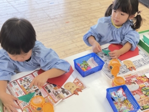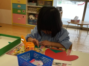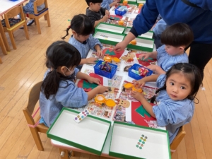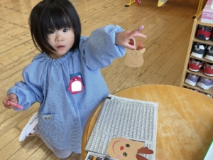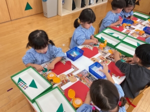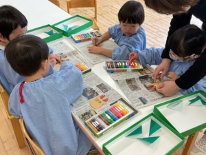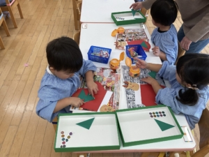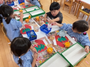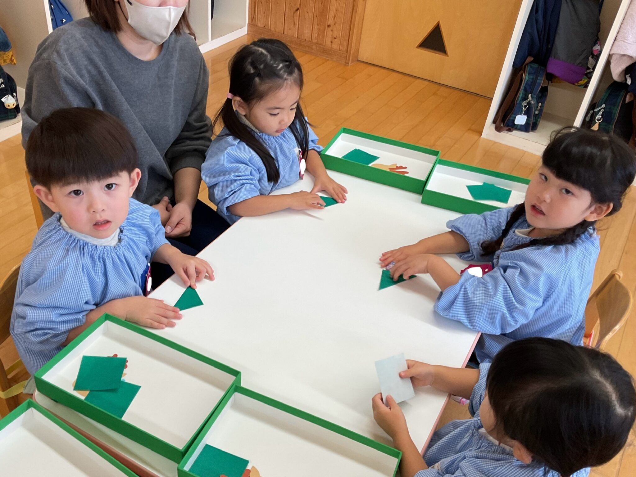 ことりぐみさんが、クリスマスに向けて製作をしました。今回、初めて折り紙を折りましたよ。 三角のおにぎりみたいだね。はみ出さないように折れるかな? トナカイさんの顔をクレヨンで描いて