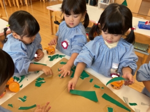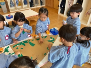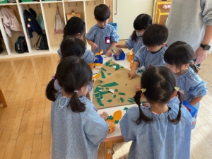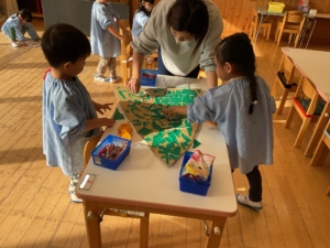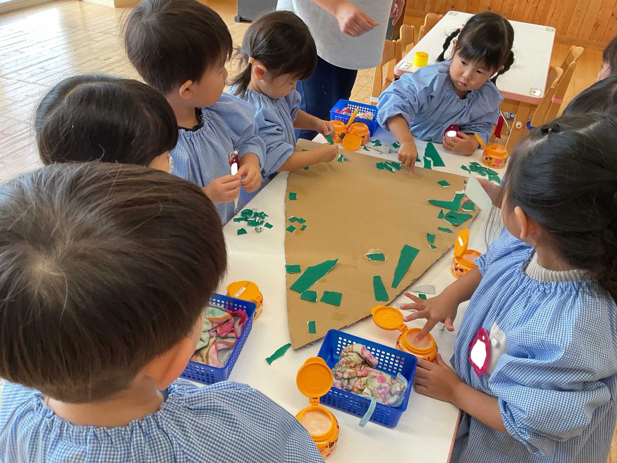 手を拭く時は濡れたタオルでね。ちゃんと並んで使えるよ! さあ、もうすぐだ あれれ?最後は作ってる人が少なくなってたけど、こんなに緑色になってきたね。今度は飾り付けもするんだって〜楽しみだね😊