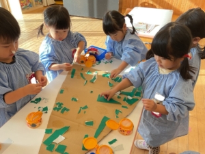 ことりぐみさんが、みんなで折り紙をビリビリして… のりを伸ばしてペタペタ