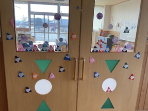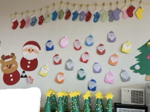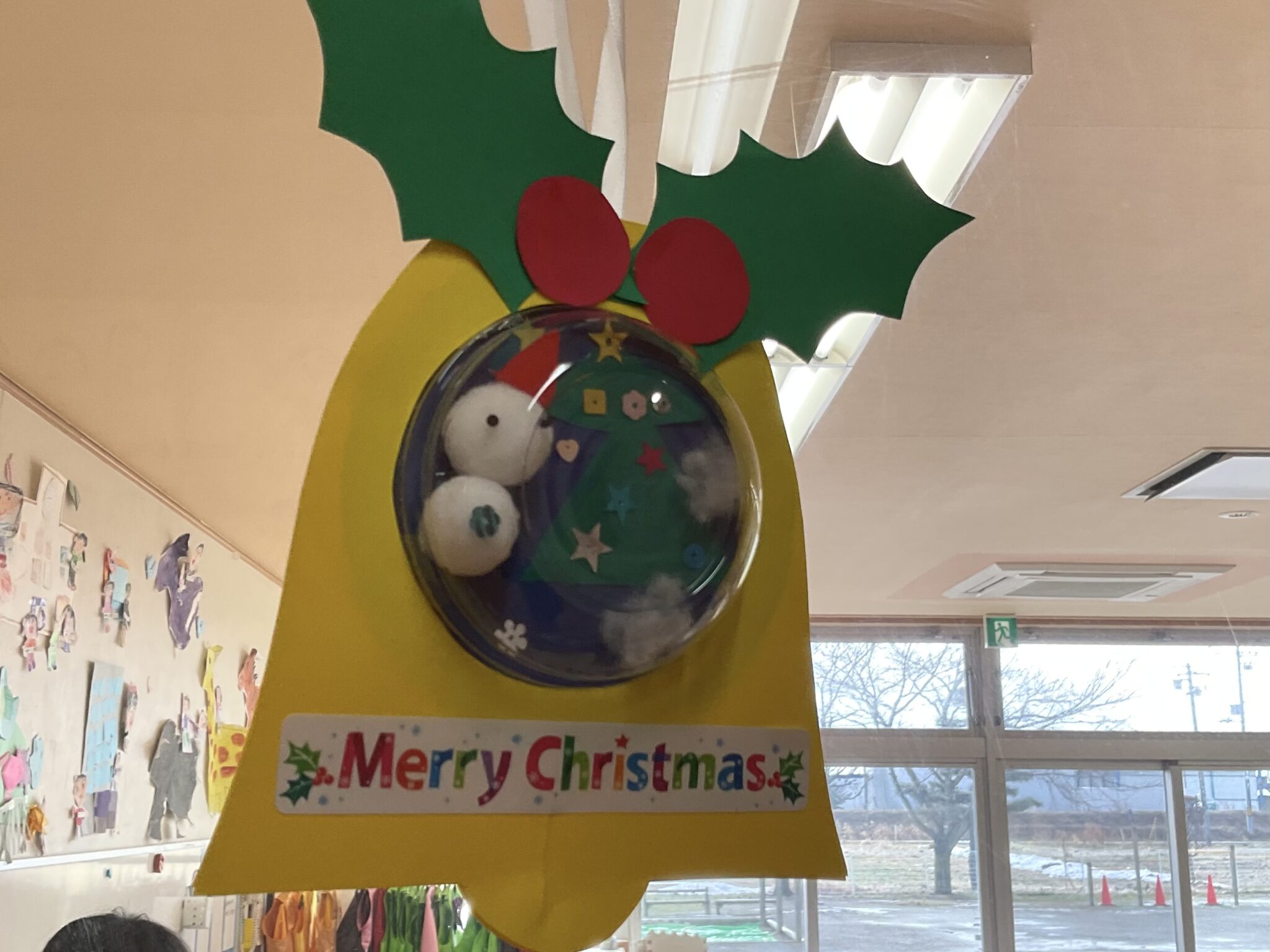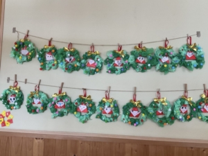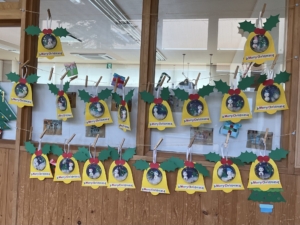 園内がクリスマス🎄の飾りでいっぱいになりました。年長さんはベルの形の飾り。中には雪だるまもいますね。