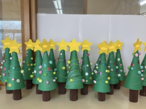 年中さんはサンタの折り紙制作に、ツリー🎄も作りました。自分で考えた模様の飾りがとても綺麗✨