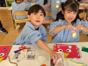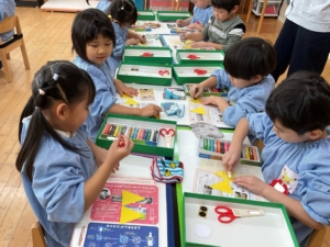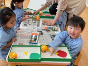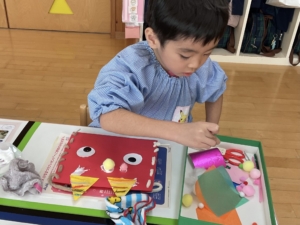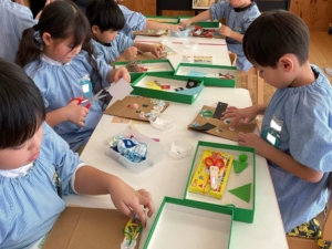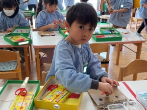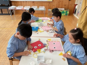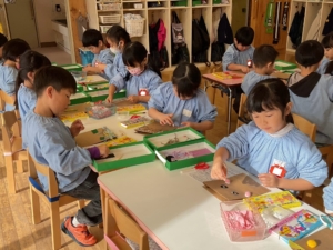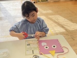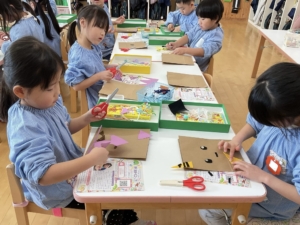 おひさま、あおぞらぐみは目の形や髪の毛、目などいろんな素材を選び、ハサミで好きな形に切って、組み合わせて作りました。全て個性豊かな、同じ作品はないオリジナルの鬼になっています。節分が楽しみですね。