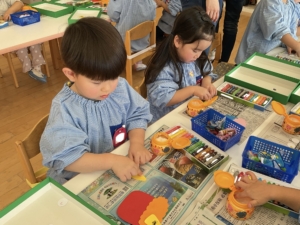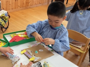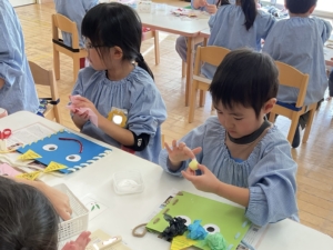 にじ、ほしぐみは自分たちで素材選びです。どんな髪の毛にしようかな。ほっぺもつけていい?豆入れのバックは、穴に毛糸を通して作りました。