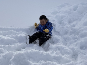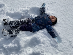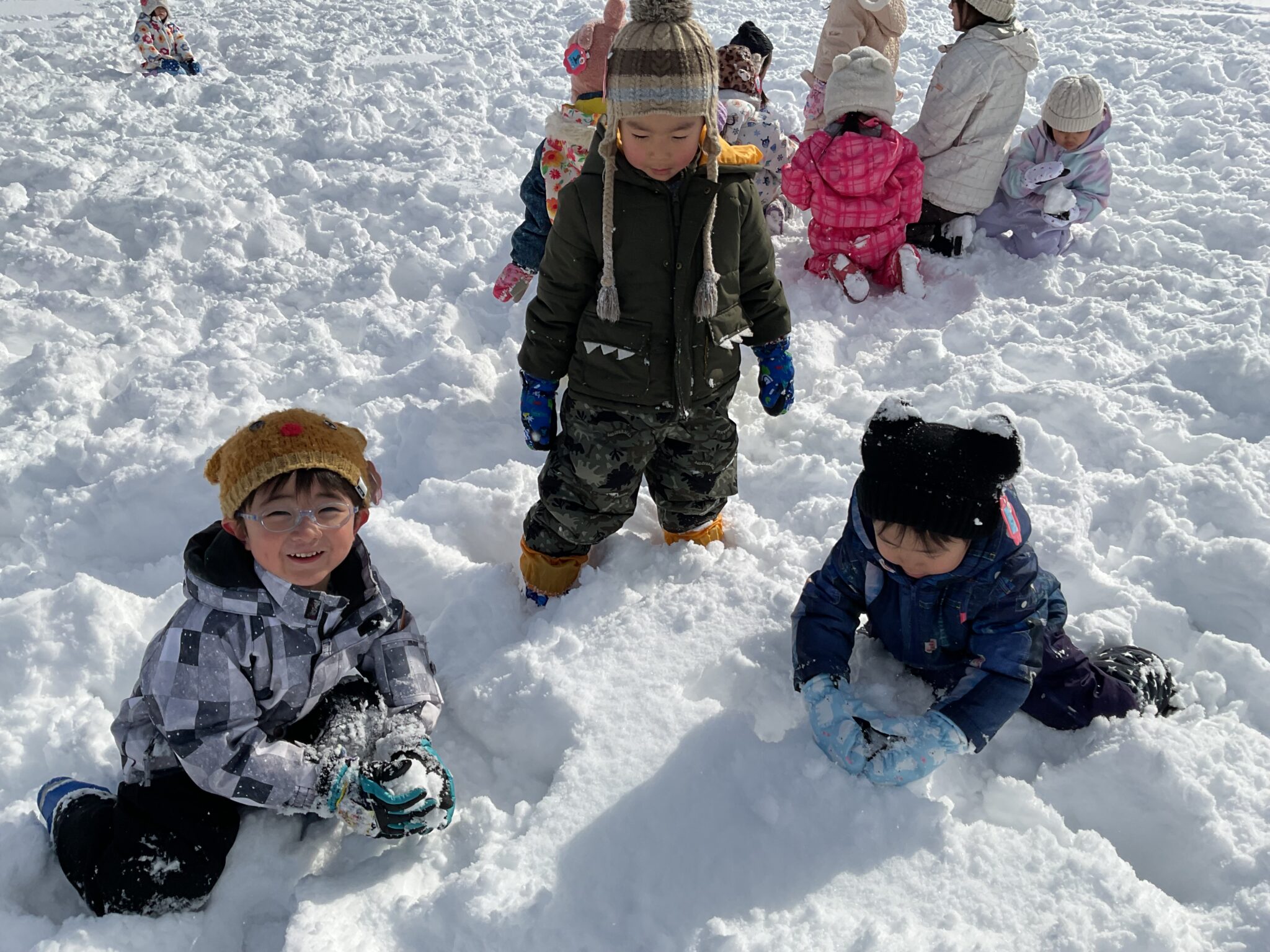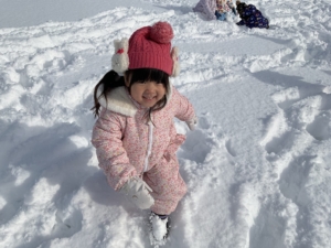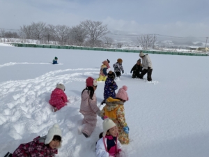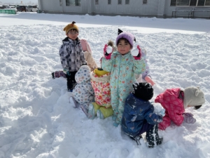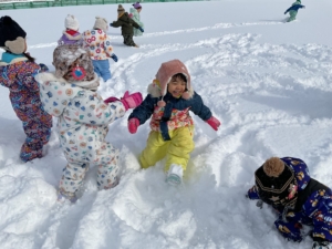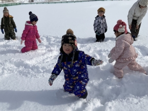 寝転がったり、雪玉を作ってみたり、とても気持ちよく遊べました。 大変だ!先生に雪の上に転がされたお友達がいる〜! みんなで仕返しだ〜!やったね、大成功〜✨