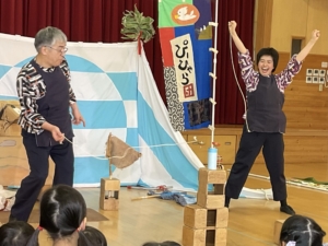 コマやお手玉、けん玉の技を見せてくれたり 小さいけど大活躍した消防車のお話をしてくれたり