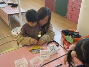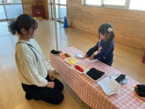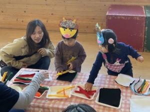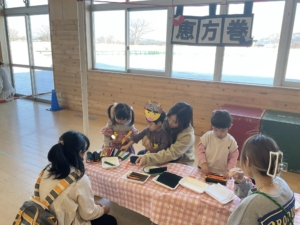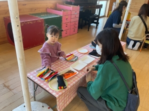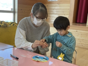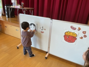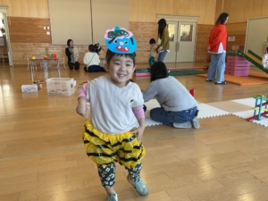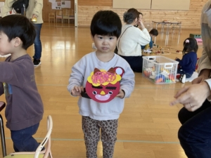 今日はほっぺちゃんクラブがありました。製作では、鬼のお面を作りましたよ。