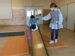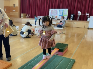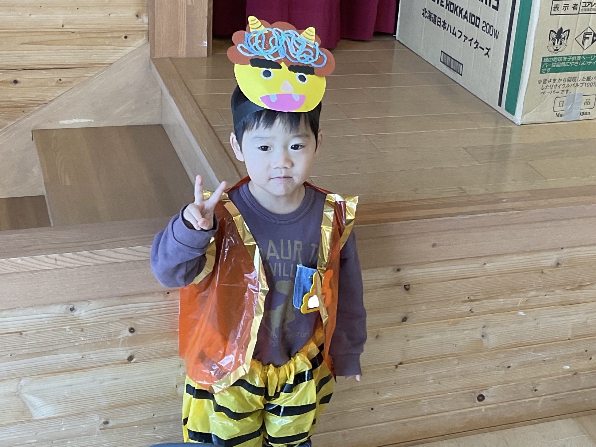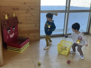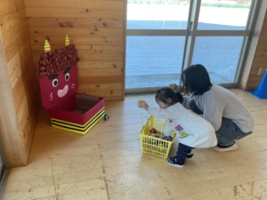鬼に豆をぶつけるコーナーや、滑り台に平均台、大好きな車やママごとでたくさん遊びました🎵