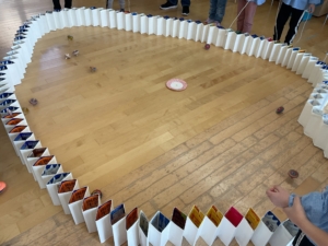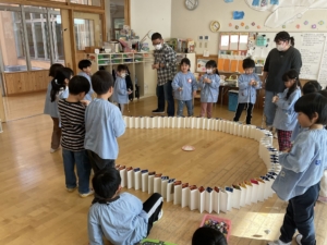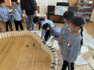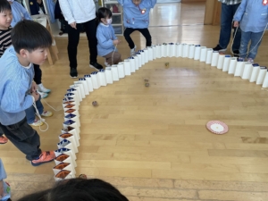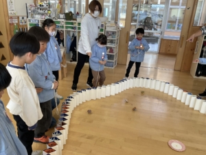 「園長先生、コマ大会の勝負をお願いします!」とおひさまさん。 「よし、勝負しよう!」 みんな、準備はいい? 行くよ、それ〜! みんなのコマも回っています。